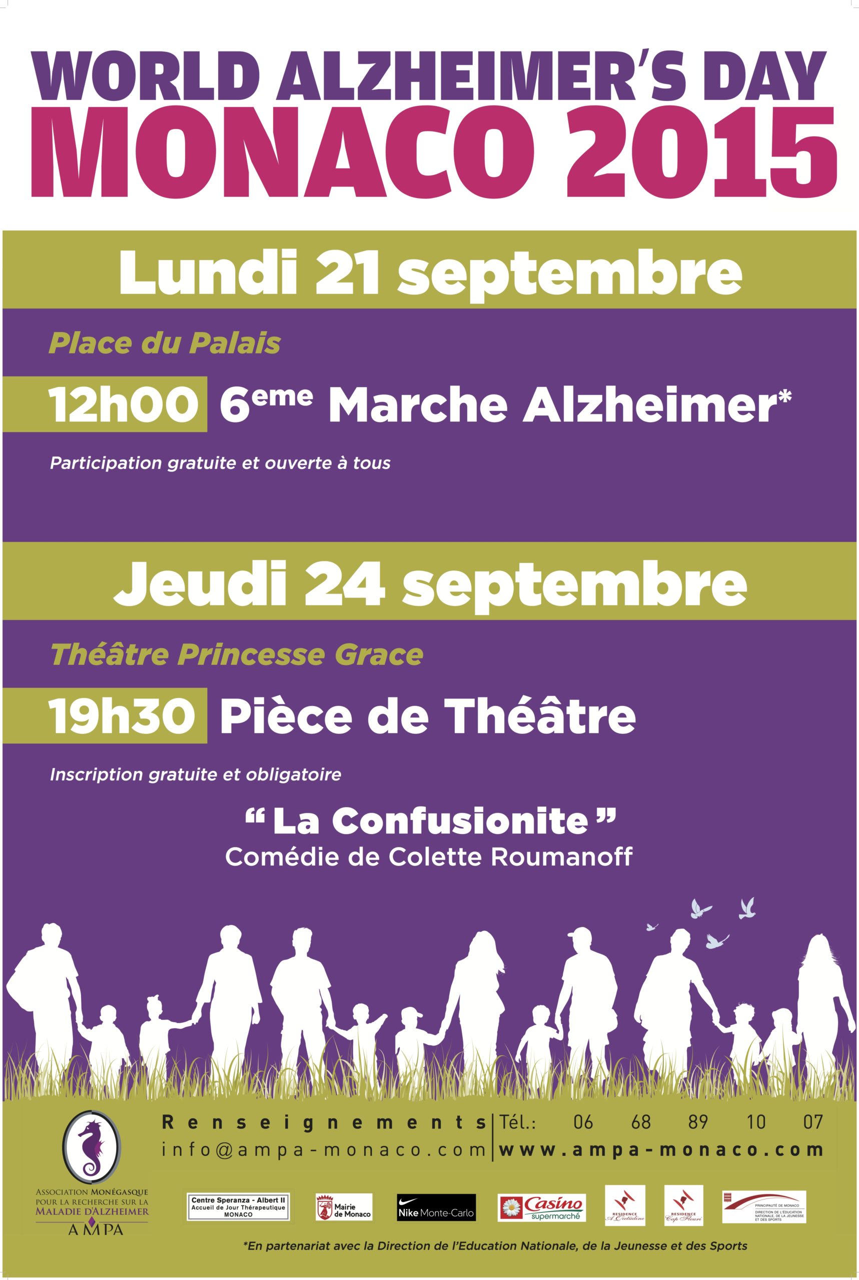 A l’occasion de la Journée Mondiale Alzheimer, l’AMPA organise la 6ème Marche Alzheimer le lundi 21 septembre 2015 à 12h (départ de la Place du Palais). La participation est gratuite et ouverte à tous.